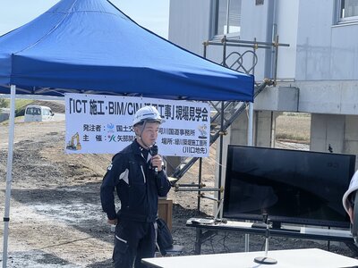 開式としまして、熊本河川国道事務所の高松係長よりご挨拶を頂き、「ICT施工及びBIM/CIM活用工事」を活用した体験学習をさせて頂きました。