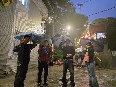 10時55分の福岡発の便で桃園国際空港へ向けて出発。初日の目的地は台北でした。到着後は台湾のランドマーク・台北101を見学。わずか40秒ほどで展望台のある89階へ到着し、曇り空の中でも台北の街並みと超高層ビル群を一望しました。中にはその高さに思わず足がすくむ生徒も。その後、人気観光地・九份を訪問。雨の中、狭い坂道を傘を避けながら歩く大変さもありましたが、某アニメ映画の舞台として知られる幻想的な街並みを堪能しました。麓のレストランで夕食をとった後、早めにホテルで休みました。