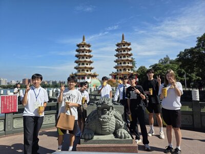 午前中はリーディングの授業を受けた後、バスツアーで校外へ。まずは液晶・LEDパネルの世界的メーカー「AUO」を訪問し、最新のスマートオフィスに驚きの連続。昼食には台湾の定番グルメ・牛肉麺とタピオカミルクティーを堪能。どちらも日本人の口に合う味で、生徒たちはあっという間に完食しました。午後は高雄を代表する観光地「龍虎塔」へ。Sally先生から教わった作法に従い、ご利益を願って塔の最上部まで上りました。夕方はホストステューデントと過ごす最後の夜。ハロウィン仕様の巨大ランタンを見たり、スーパーでお土産を買ったりと、それぞれが思い思いの時間を楽しみました。