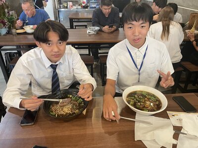 朝から新幹線で高雄へ移動。駅で本校の交流担当・Sally先生と合流し、バスで学校へ向かいました。到着後すぐに歓迎式が行われ、ホストステューデントたちと笑顔で初対面。ジェスチャーを交えながら、互いに打ち解ける姿が見られました。自動車科の実習を見学した後は、英語の授業で自己紹介と学校紹介を実施。拙い英語ながらも、現地生徒の温かい拍手に支えられて発表をやり遂げました。夕方はホストステューデントとともに夜市を散策。地元ならではの料理を楽しみ、台湾の食文化を肌で感じました。