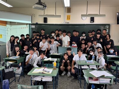 最終日はSally先生の英会話授業に参加し、これまでの交流の感想を英語で発表。クラスからのQ&Aコーナーでは「K-POPで好きなアーティストは?」という質問に、原口美空さん(総合学科1年)が即興で得意のダンスを披露し、大きな歓声と拍手が沸き起こりました。最後にホールで集合写真を撮影し、交流を締めくくりました。