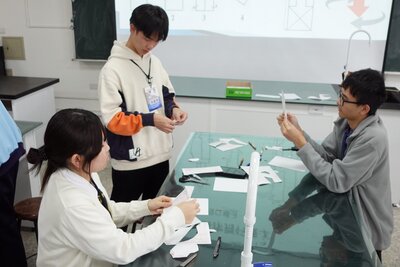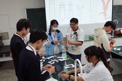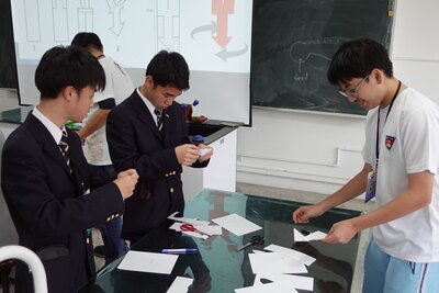 午後は、台南随一の進学校である台南第一高級中学を訪問。門をくぐると同時に、在校生が笑顔で駆け寄ってくる温かい歓迎を受けました。物理の授業体験では「飛行種子」の構造模型を制作し、現地の生徒と試行錯誤しながら理解を深めました。 校内には日本統治時代の赤レンガ校舎が今も現役で使われており、壁に残る太平洋戦争時の機銃掃射の跡に歴史の重みを感じる一方、4階建ての近代的な体育館など新旧が調和したキャンパスに生徒たちは驚いていました。また、休憩時間には日本のアニメやドラマといった共通の話題で盛り上がり、同世代ならではの交流を深めることができました。