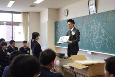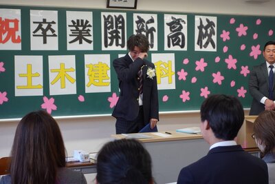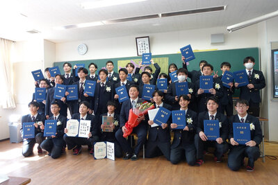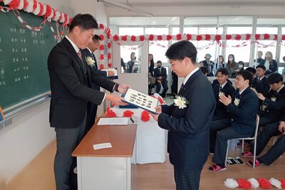 3年間切磋琢磨した学び舎を巣立つ卒業生たちは、緊張と寂しさ、そして喜びが入り混じりながらも、晴れ晴れとした表情で入場しました。国歌斉唱に続き、卒業証書授与。各科の代表が名前を呼ばれ、学校長から卒業証書が授与されました。厳粛な雰囲気の中、代表者の堂々とした姿が印象的でした。続く在校生送辞では、生徒会長の木村夢さん(総合学科2年)から先輩方への憧れと感謝の気持ちが送られました。卒業生答辞は旧生徒会長の横田佑馬君(電気情報科3年)が務め、本校での思い出、共に歩んだ友人や先生方、そして何より家族への深い感謝を、心を込めて言葉にしました。式終了後の最後のホームルームでは、担任から一人ひとりに卒業証書が手渡されました。クラスメイトや保護者の前で感謝を述べる姿には笑いと涙が溢れ、それぞれが別れを惜しむ温かな時間が流れました。