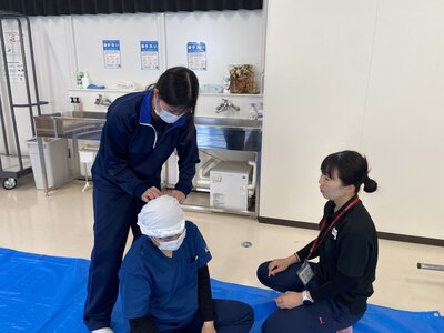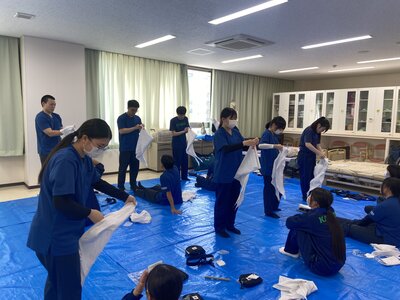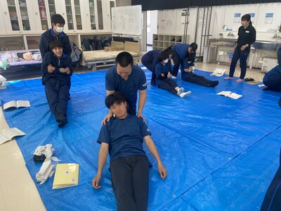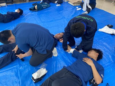 講習では、止血法や包帯の使い方、骨折の手当てといった応急手当から、心肺蘇生法やAEDを用いた救命措置まで、実践的なトレーニングが繰り返されました。