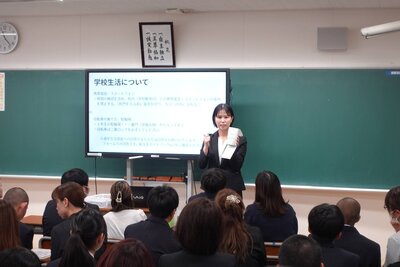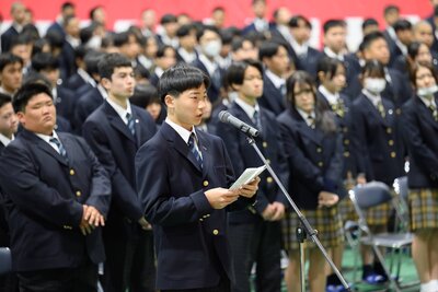 期待と不安を胸に登校した520名の新入生。初めて顔を合わせるクラスメイトと共に、緊張感が漂ったまま会場へ入った彼らでしたが、温かい拍手で迎える保護者の方々の姿に、少し安堵したような表情を見せていました。式典ではまず学校長より、これからの道を明るく切り拓くための前向きなメッセージが贈られました。続いて、新入生を代表して普通科の樋渡煌道君が、「これまで支えてくださった方々への感謝を胸に、この学び舎で多くのことを吸収したい」と、力強く誓いの言葉を述べました。