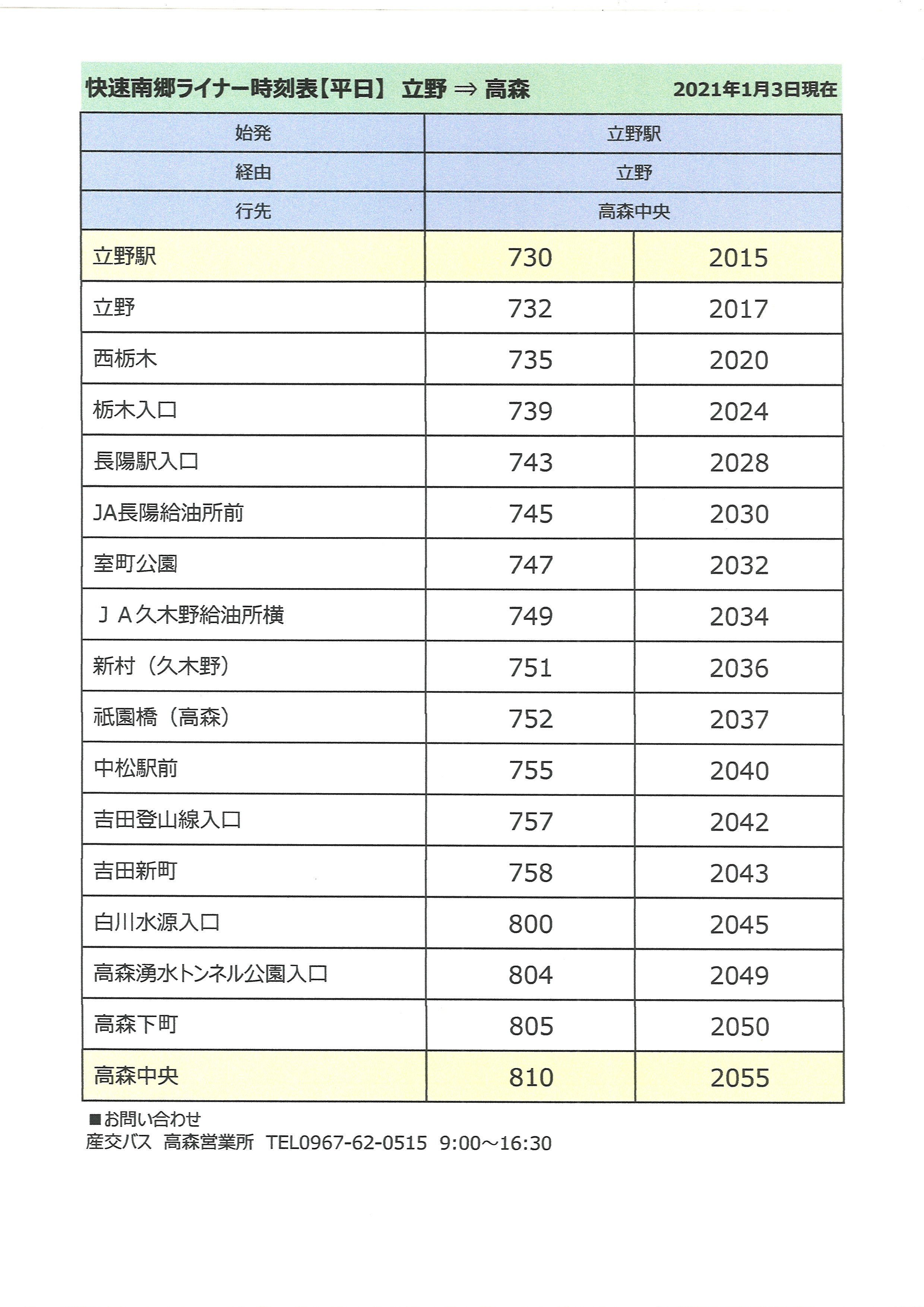 12月23日(水)に、熊本県から、南郷ライナー(阿蘇通学支援バス)のダイヤが令和3年1月3日(日)から改正になるとの連絡が入りましたのでお知らせします。